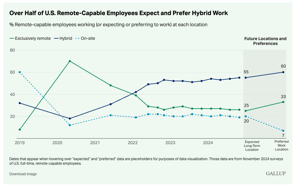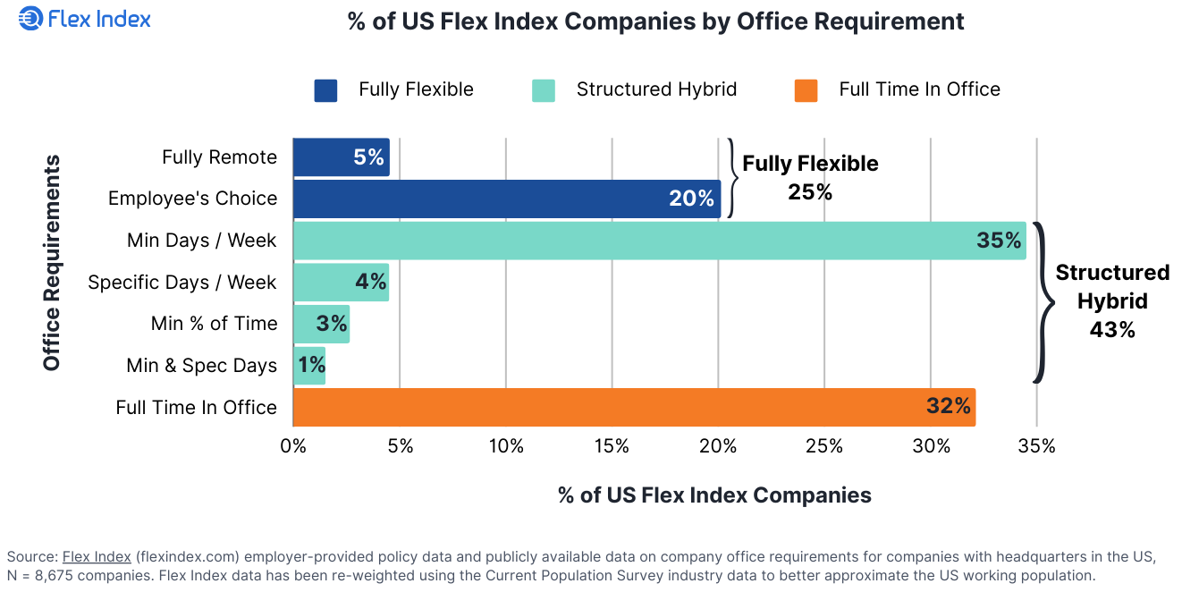 OK, you caught us: We made this one up but it fits. After a period of trial and error (and RTO starts and stops), flexible work was widely embraced by the majority of U.S. firms, with 67% offering work location flexibility. A mature “structured hybrid” model emerged to help solidify its popularity. The Flex Report found that 43% of U.S. companies had adopted this model, which requires employees to be onsite a certain number of days and for a certain set of hours.