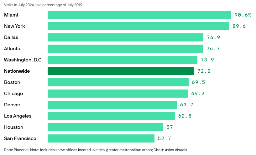 Data from analytics company Placerai finds that the metro area is a leader in return-to-office growth, outpacing major metros such as Miami, San Francisco, Los Angeles and New York. Office visits in July 2024 rose to more than three-quarters of levels reported in July 2019, four percentage points above the national average. It also shows that office foot traffic in Atlanta, including some of its suburban job centers, had increased more than 7% since 2023, compared to just 1.8% nationally for the same time period.